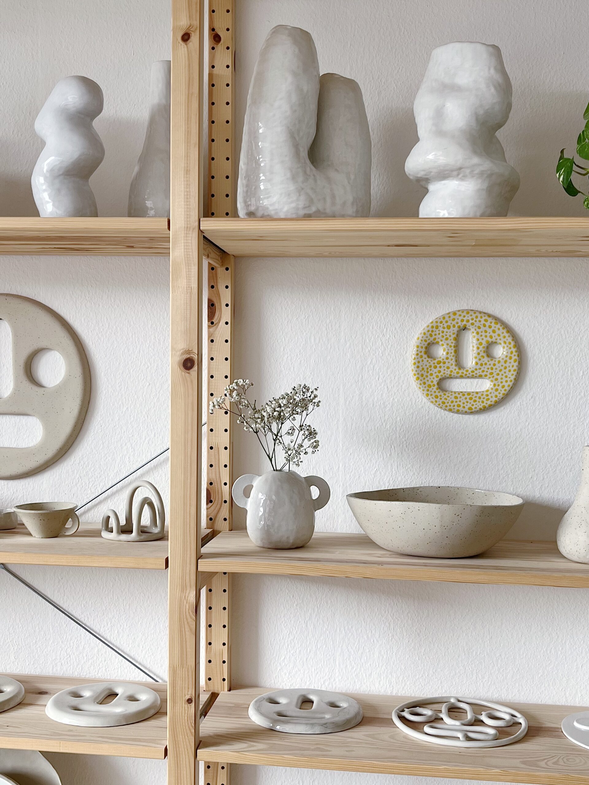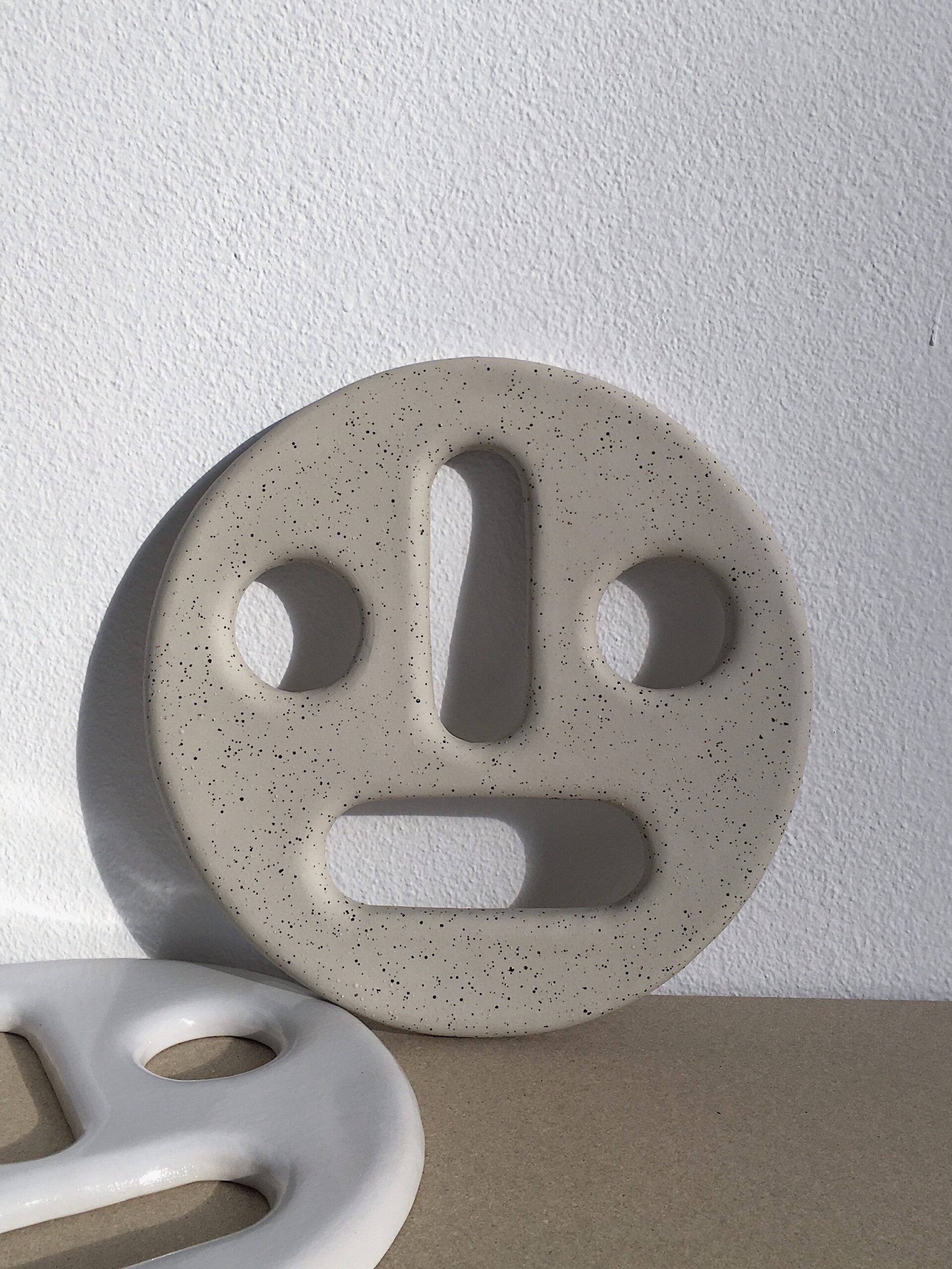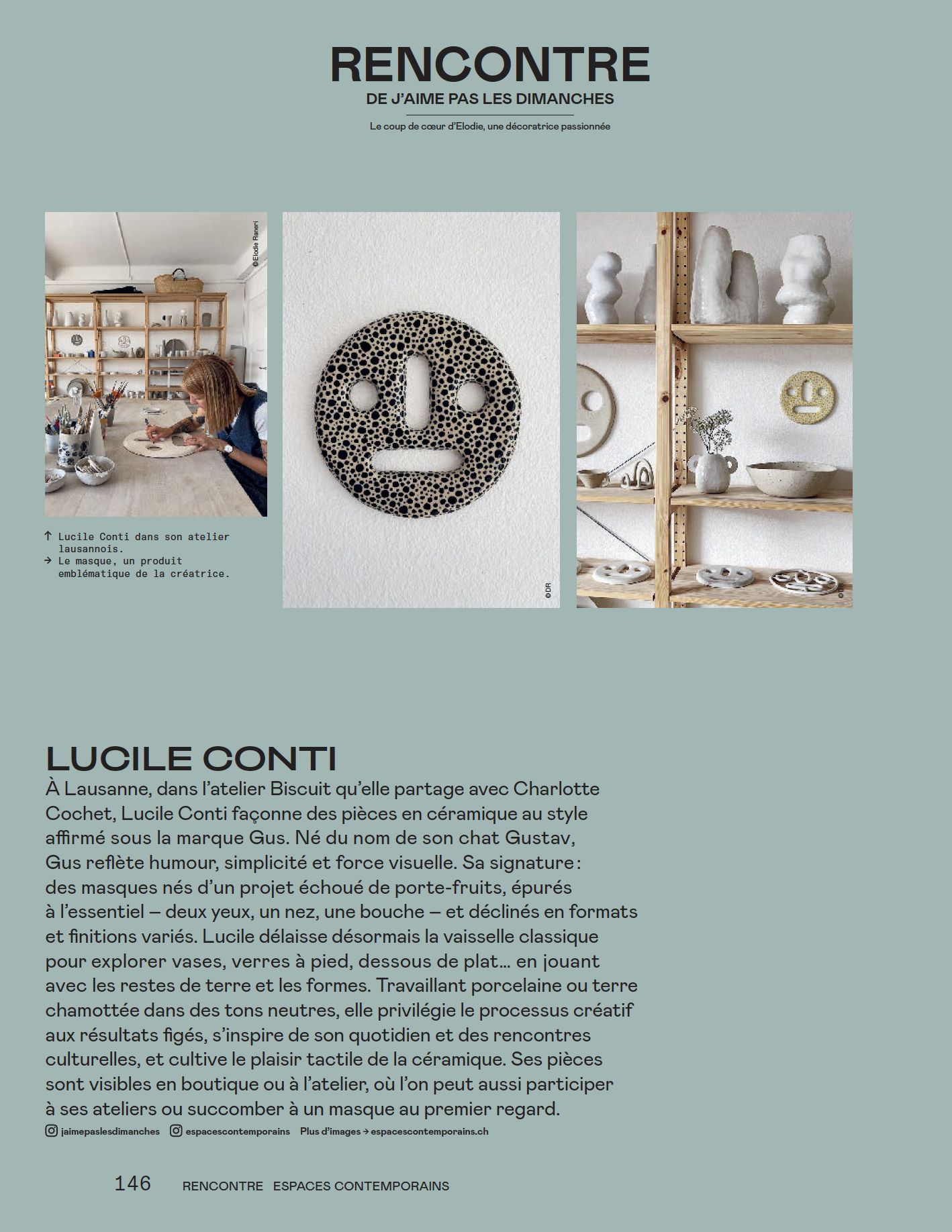 À Lausanne, Lucile Conti façonne des pièces en céramique au style affirmé sous la marque @gus_studio . Né du nom de son chat Gustav, « Gus » reflète humour, simplicité et force visuelle. Sa signature : des masques nés d’un projet avorté de porte-fruits, épurés à l’essentiel deux yeux, un nez, une bouche et déclinés en formats et finitions variés.